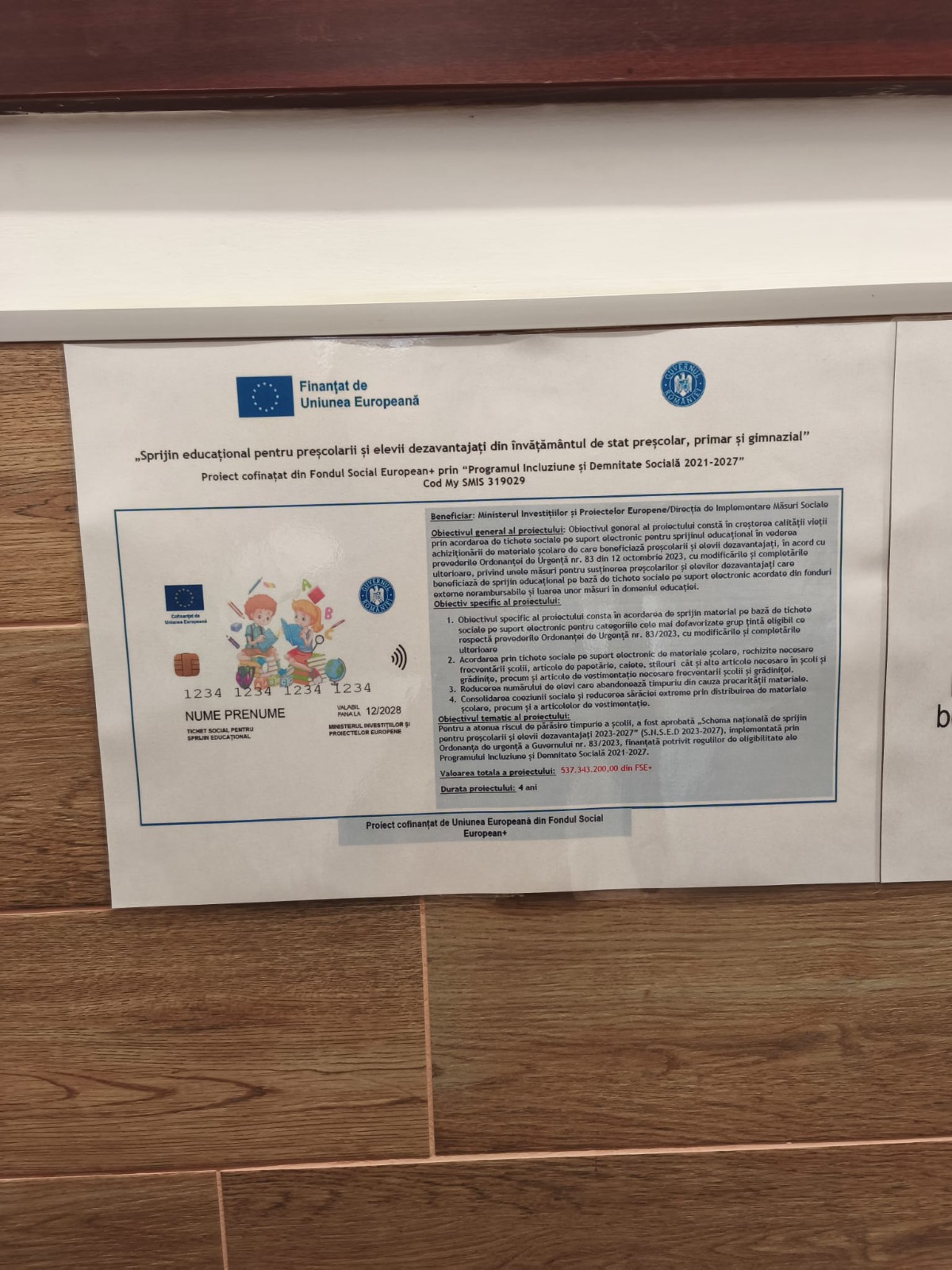„Sprijin educațional pentru preșcolarii și elevii dezavantajați din învățământul de stat preșcolar, primar și gimnazial” – Obiectivul general al proiectului constă în creșterea calității vieții prin acordarea de tichete sociale pe suport electronic pentru sprijinul educațional în vederea achiziționării de materiale școlare de care beneficiază preșcolarii și elevii dezavantajați, în acord cu prevederile Ordonanței de Urgență nr. 83 din 12 octombrie 2023, cu modificările și completările ulterioare, privind unele măsuri pentru susținerea preșcolarilor și elevilor dezavantajați care beneficiază de sprijin educațional pe bază de tichete sociale pe suport electronic acordate din fonduri externe nerambursabile și luarea unor măsuri în domeniul educației.